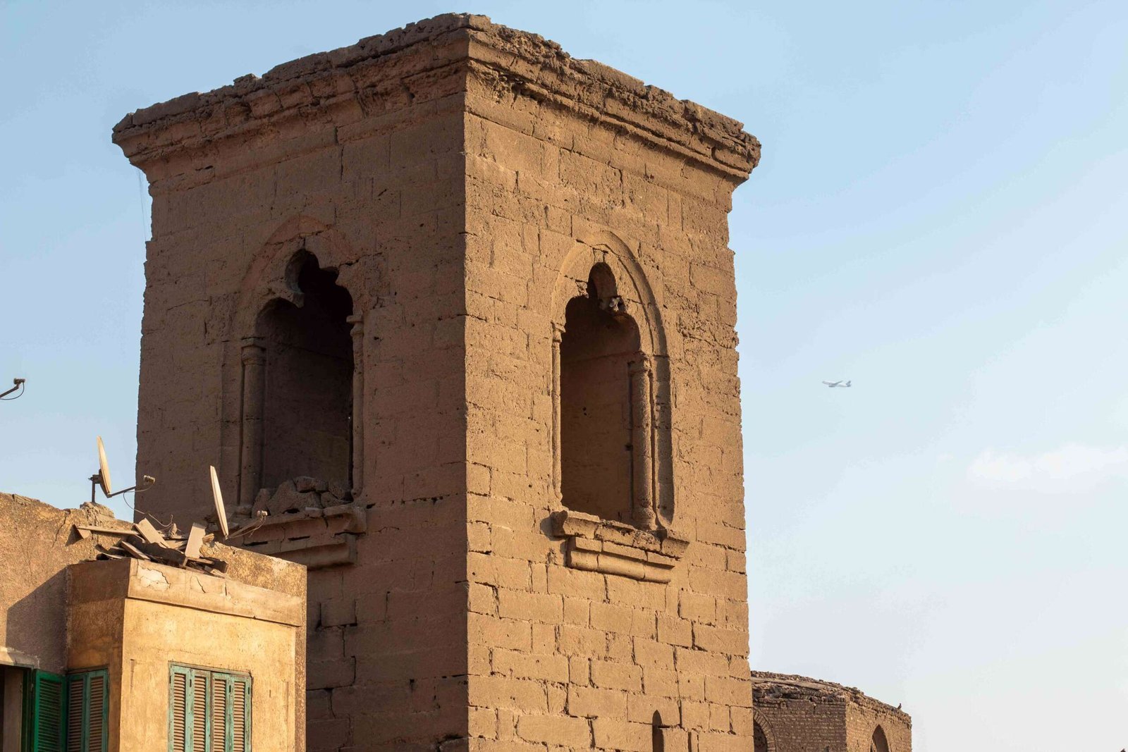 This photograph highlights a historic stone tower on Al-Ashraf Street in Historic Cairo, distinguished by its solid masonry, arched window openings, and weathered surfaces shaped by time. The structure stands as part of the area’s rich network of shrines and religious landmarks, showcasing classic Islamic architectural elements. Set against an open sky, the tower emphasizes the scale, durability, and cultural significance of Cairo’s historic urban fabric.