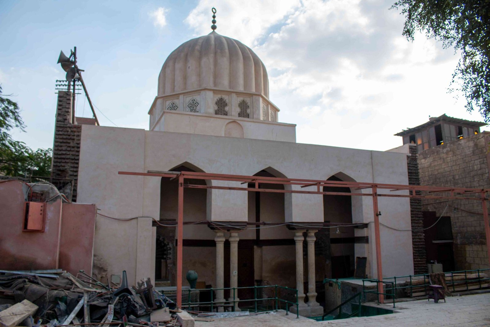 This photograph shows a restored shrine on Al-Ashraf Street in Historic Cairo, featuring a prominent dome, arched entrances, and slender stone columns forming a small courtyard. The structure highlights ongoing restoration and preservation work within one of Cairo’s most historically significant districts. Construction elements and surrounding urban details emphasize the balance between heritage conservation and contemporary city life, offering an authentic view of Islamic architecture within a living historic neighborhood.
