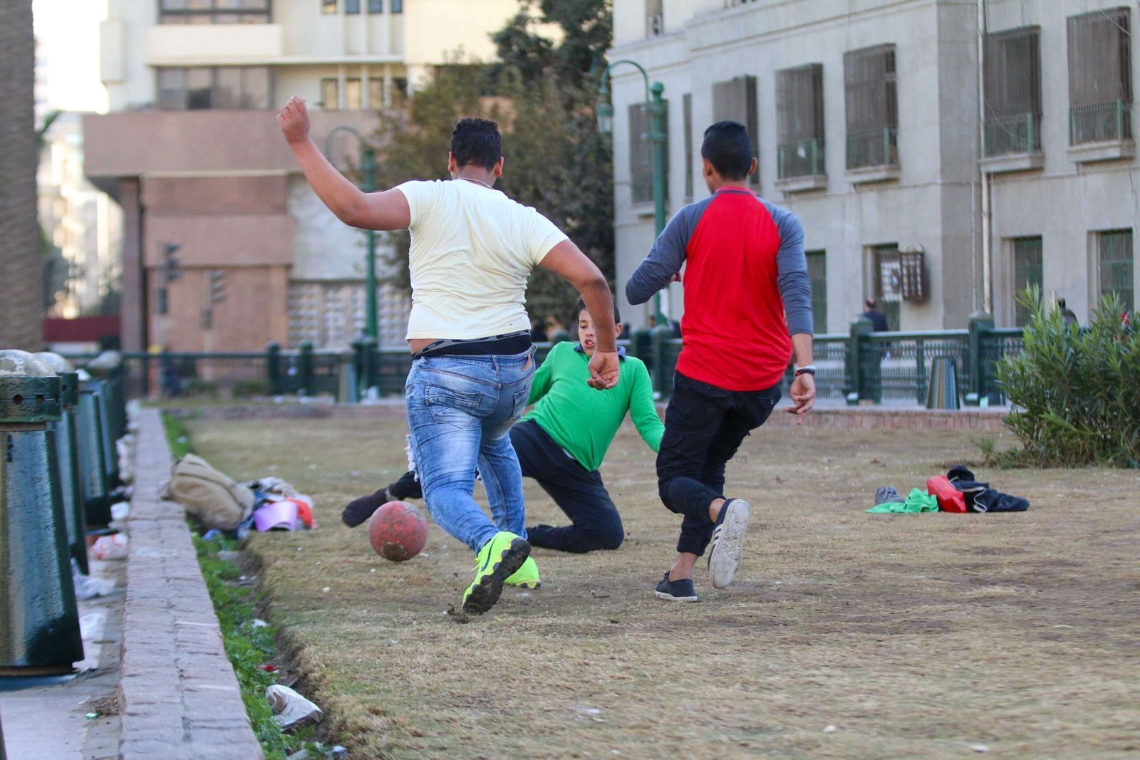 A lively action-filled moment showing boys chasing the ball and competing during a football game in an open public space near Tahrir Square. The image captures energy, movement, and teamwork, highlighting how children turn shared urban areas into active spaces for play and expression.