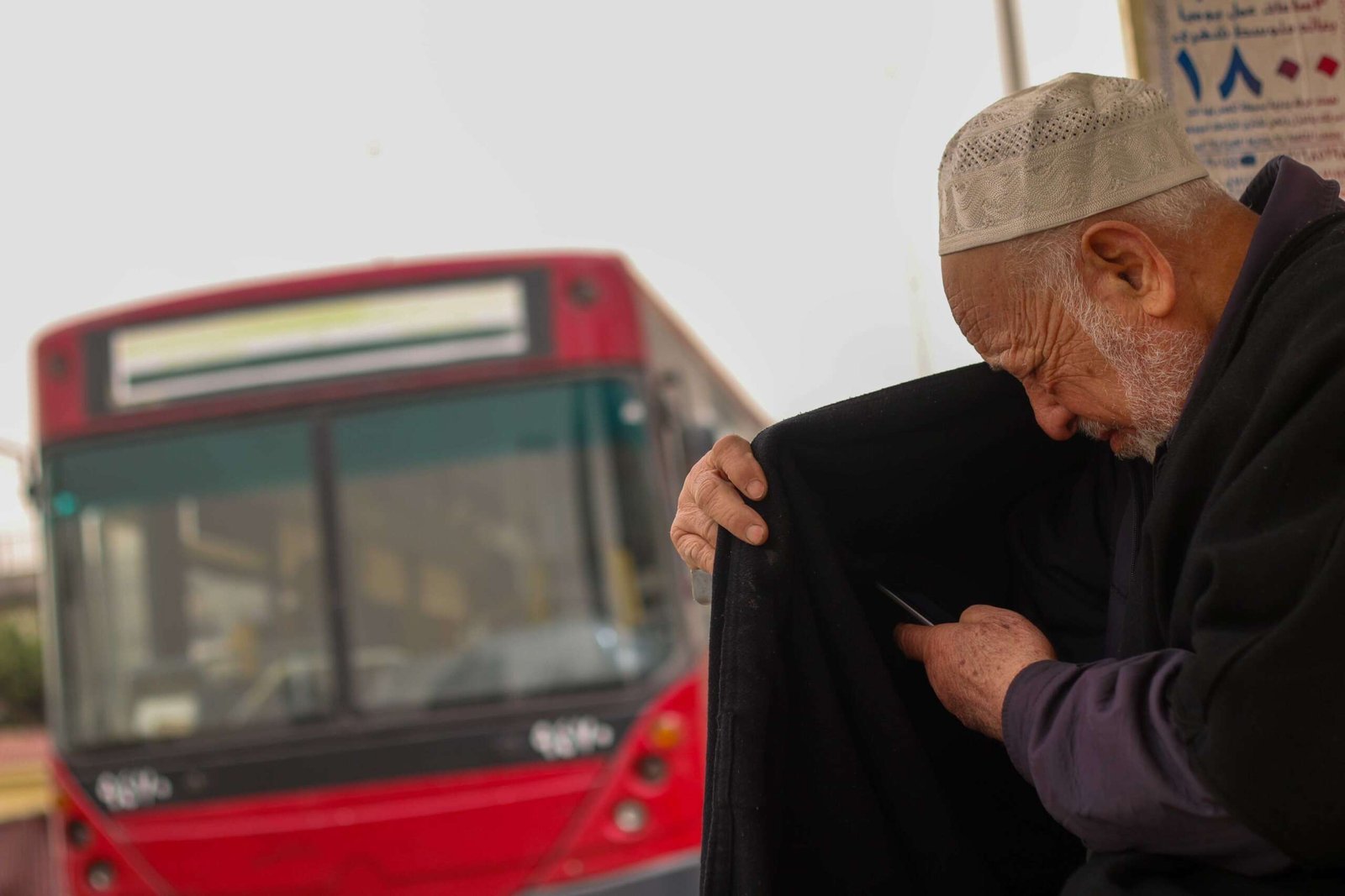 youre viewingElderly Man Sitting at Cairo Bus Stop Using Phone 3