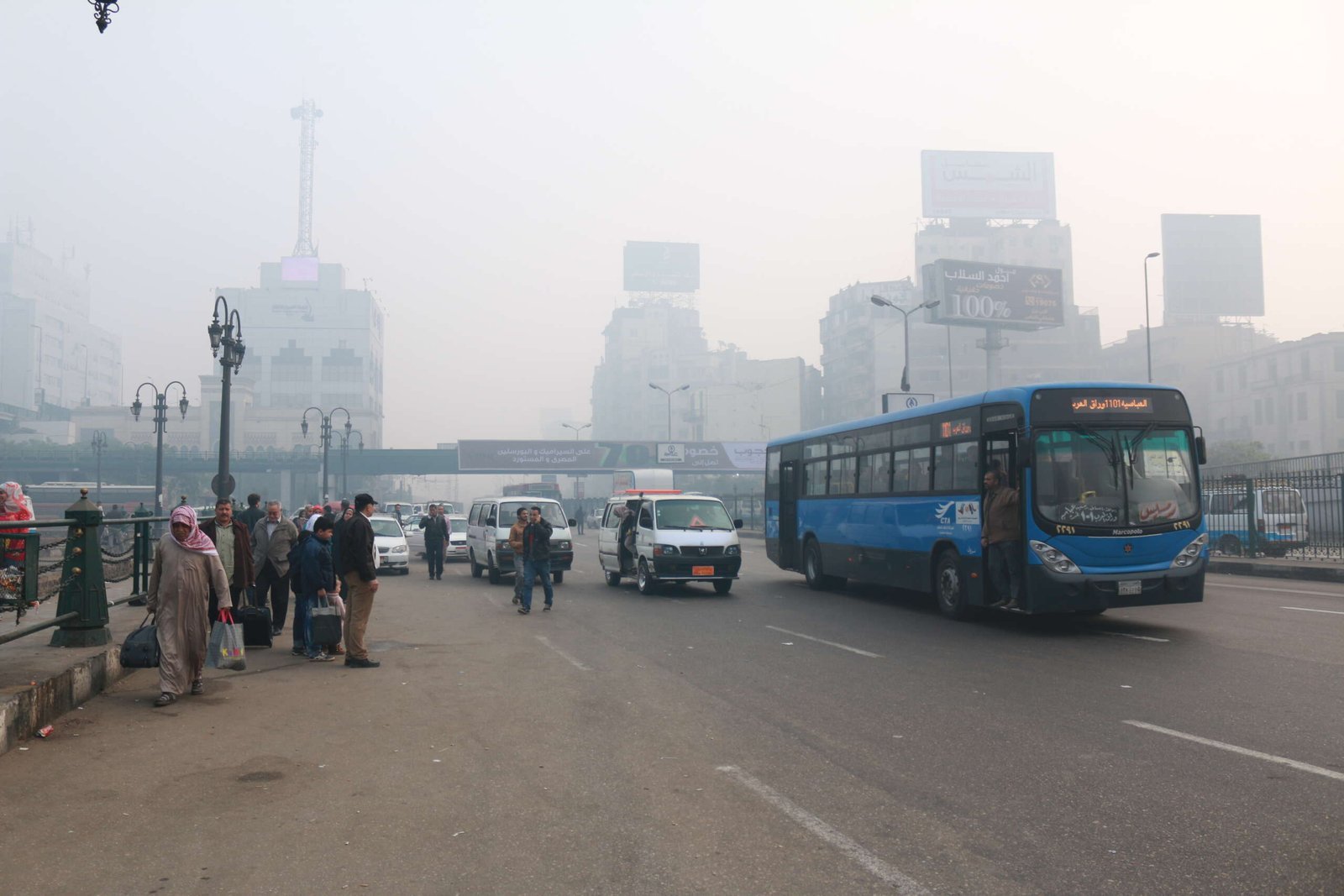 This image captures everyday life on Ramses Street in Cairo, where a blue city bus and passing vehicles navigate a wide urban road under a pale, dusty haze. Pedestrians gather near the sidewalk and railings, reflecting the rhythm of daily commuting and public transport in the city. The muted skyline and soft daylight emphasize Cairo’s busy street atmosphere and constant motion.