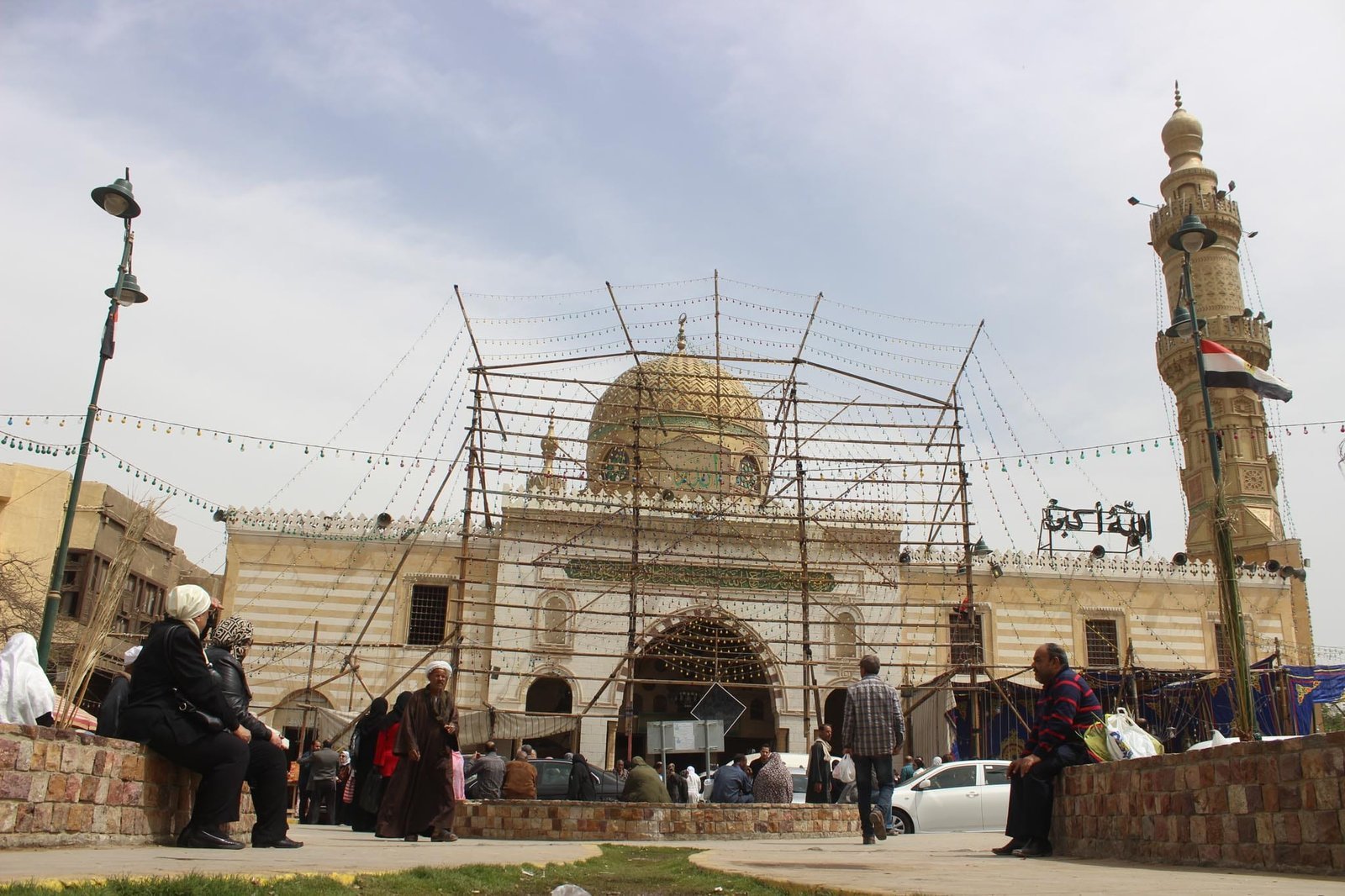 This photograph captures a traditional Mawlid Al Sayyida Nafisa in Cairo, Egypt. People sit and gather in the open public space facing the mosque and shrine, with the dome and minaret rising behind. Lights and decorations frame the setting, reflecting a living moment of faith, community, and cultural heritage in the city.