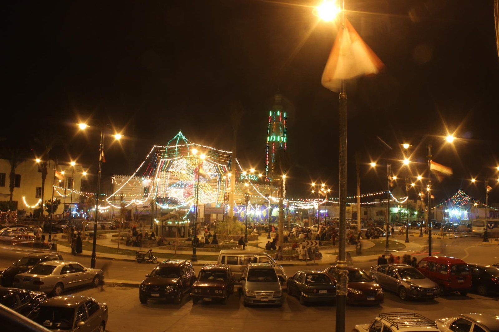 This photograph captures the energy of Al Sayyida Nafisa Mawlid in Cairo at night. Decorative lights outline the celebration area as crowds gather across the public space, with cars parked around the edges. The illuminated setting reflects local festival traditions, community life, and Cairo’s night atmosphere during a well-known religious celebration.