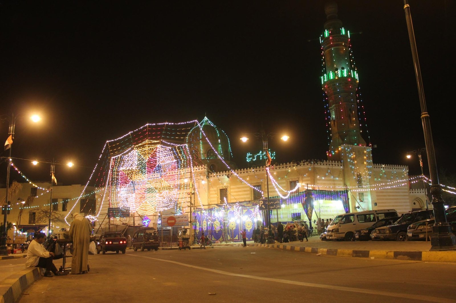 This photograph captures Al Sayyida Nafisa Mawlid in Cairo at night, where colorful decorations and lights cover the celebration area around the mosque. The illuminated minaret rises above the scene while cars and people move through the surrounding streets and public space. The image reflects community, tradition, and Cairo’s night atmosphere during a well-known local religious festival.