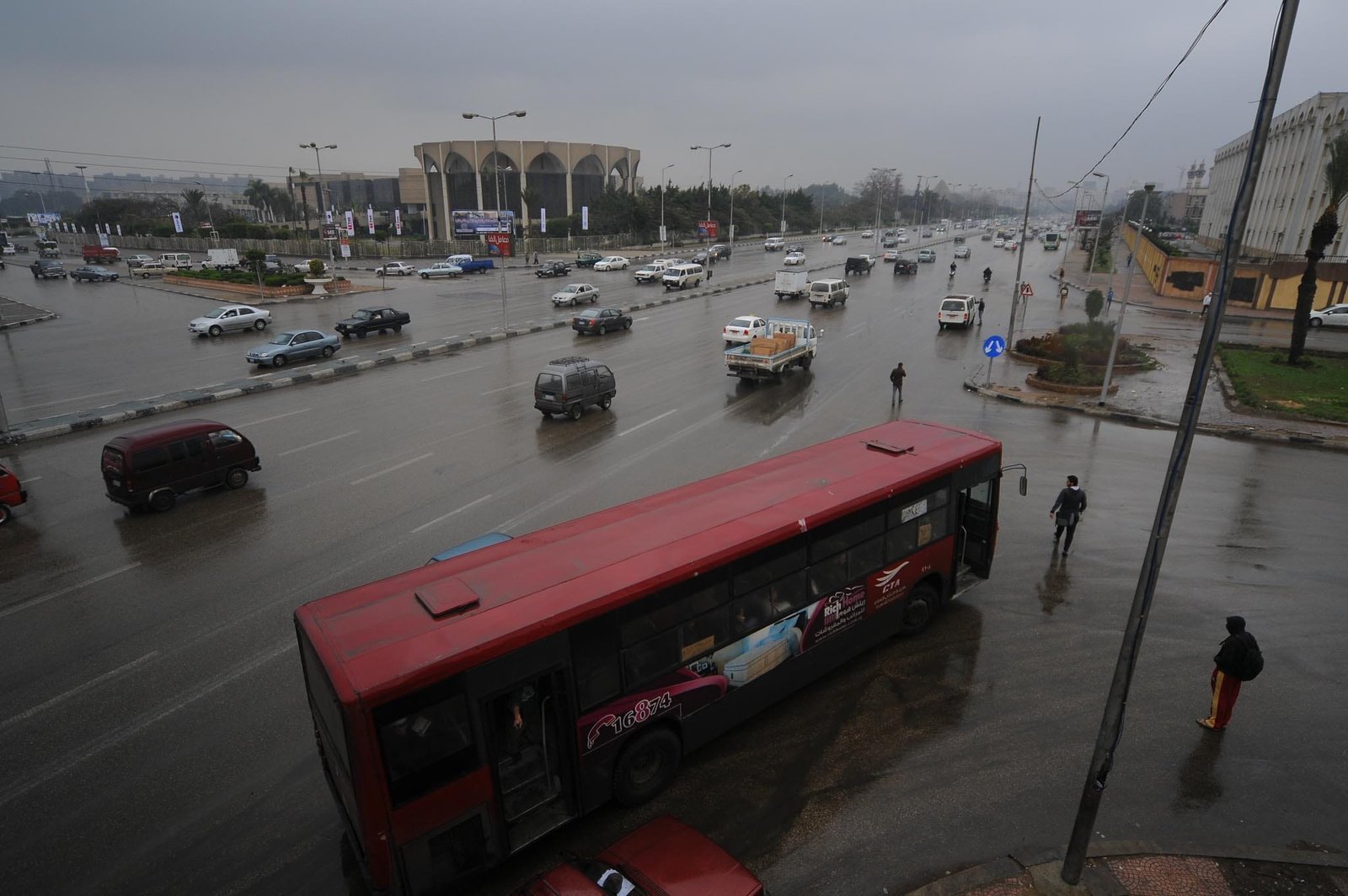 A wide urban view of a main intersection in Cairo featuring a red city bus and several cars traveling along open roads. The scene captures everyday movement and city life, with surrounding buildings and open spaces adding depth to the composition.