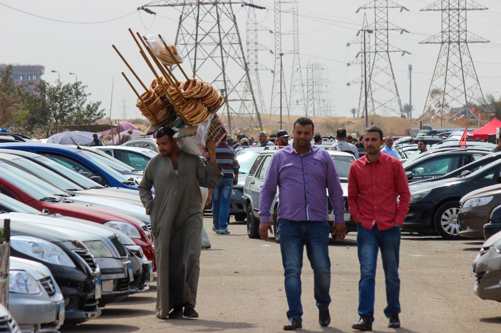 A street vendor in Cairo, Egypt, selling traditional Egyptian simit (sesame bread rings) and dukka (a spicy mix) while carrying the basket where the simit is hung. The vendor walks through a busy street, showcasing the authentic street food culture and daily life of local sellers. The image highlights traditional commerce and urban street scenes.