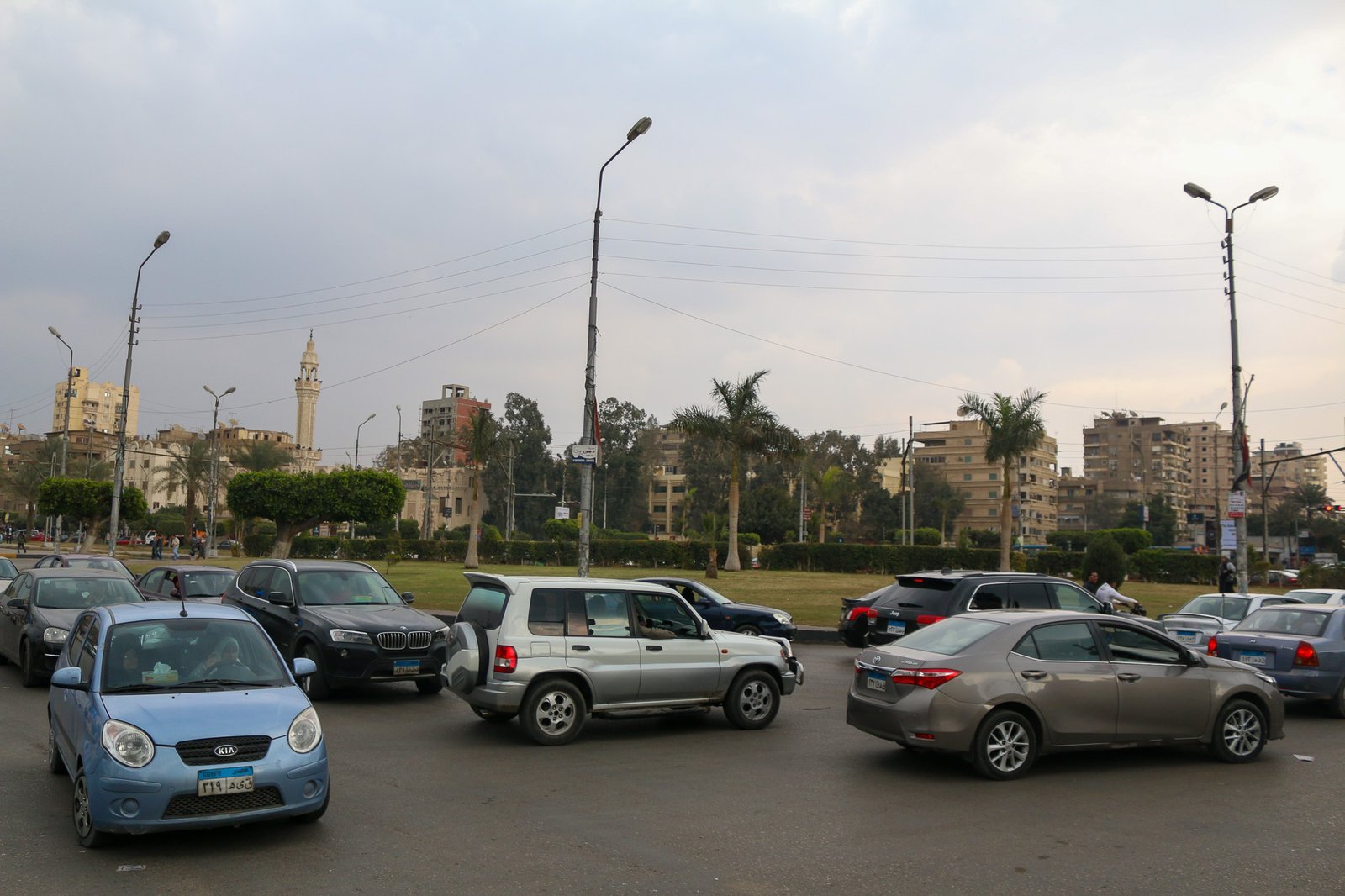 A wider urban view of traffic flowing through a major intersection in Cairo, with multiple cars navigating the junction under a cloudy, muted sky. The scene highlights the density and pace of everyday city movement, framed by greenery, residential buildings, and street infrastructure. It captures a familiar moment of Cairo’s daily life, where motion, noise, and routine coexist in a constant urban rhythm.