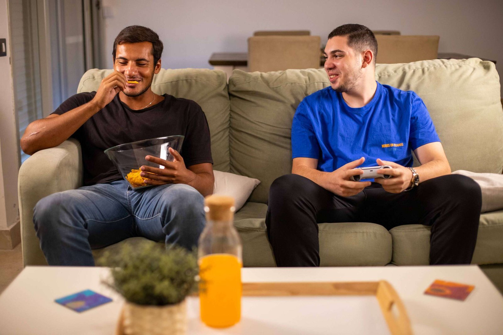 The image captures a casual home moment of two friends enjoying their time together. One of them is laughing while eating snacks from a glass bowl, and the other is playing video games with a controller in hand. The relaxed atmosphere and friendly conversation reflect a modern lifestyle and simple leisure time at home.