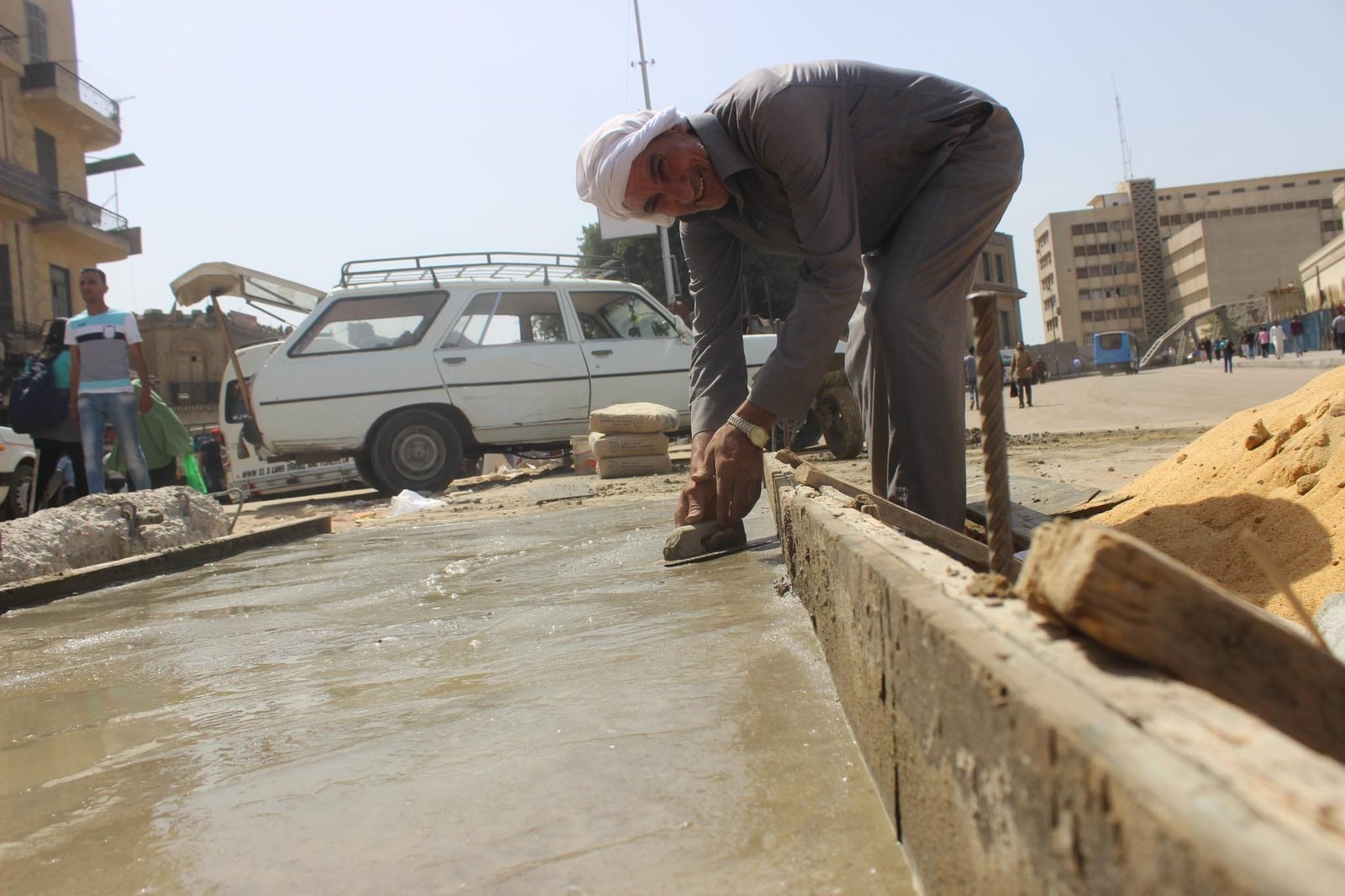 This street photograph captures a close, ground-level moment of everyday work in Cairo. A street worker carefully smooths wet cement as part of a sidewalk repair, with vehicles and city activity visible in the background. The scene highlights urban maintenance, daily labor, and the rhythm of city life in a public space.
